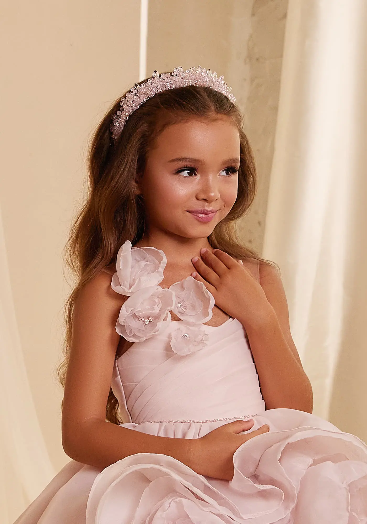 يعد طوق الرأس هذا رمزًا للرشاقة والروعة، فهو مصمم ليجعل طفلتك تشعر وكأنها أميرة. تضفي تفاصيله الكريستالية المعقدة وعناصره الثمينة هالة من السحر الذي يتكامل بشكل جميل مع أي زي.