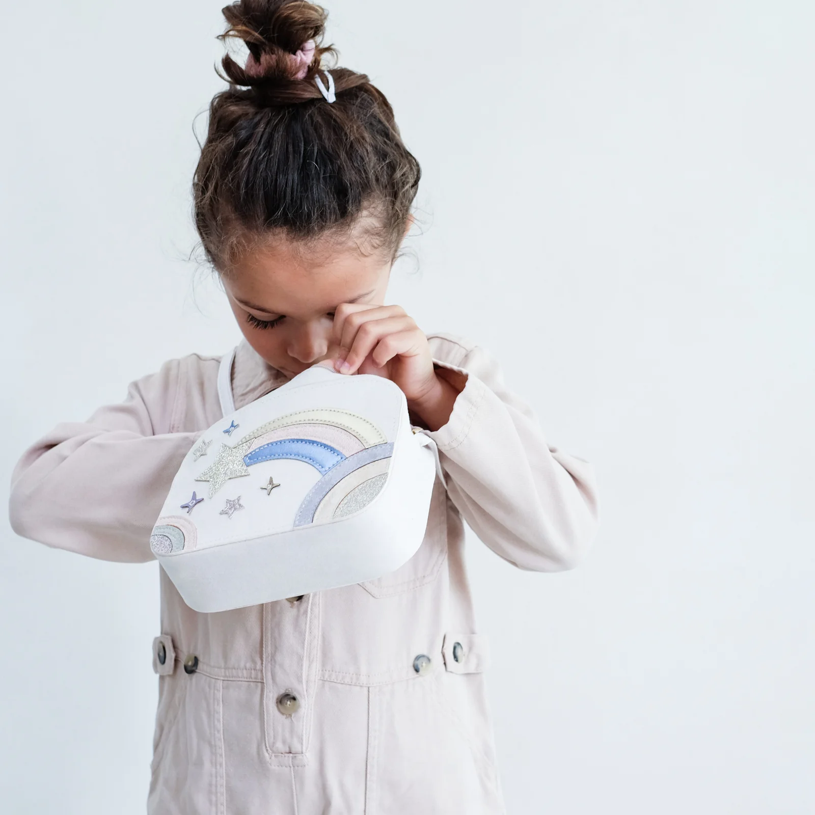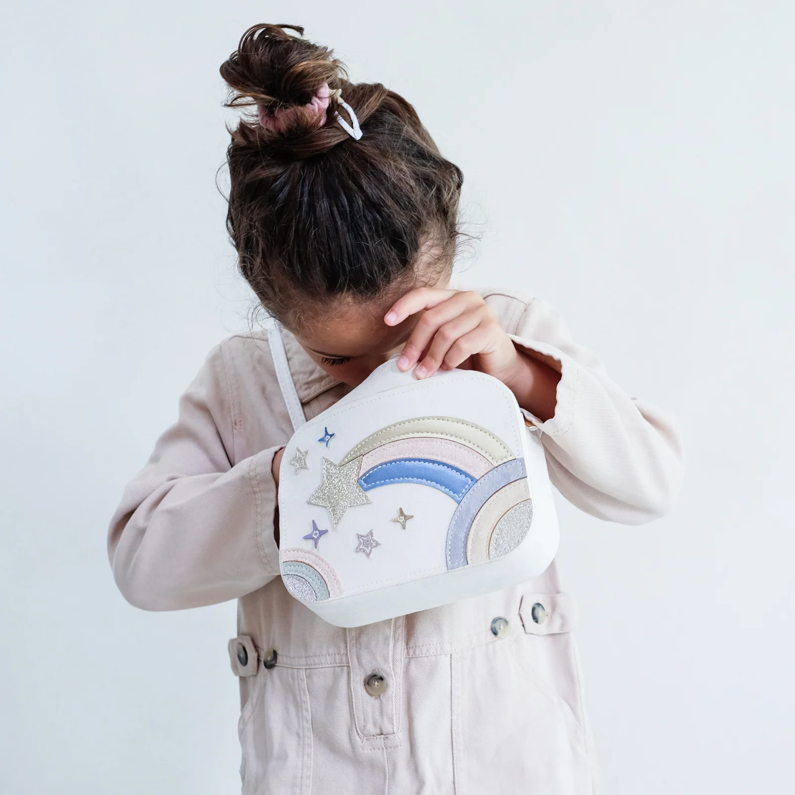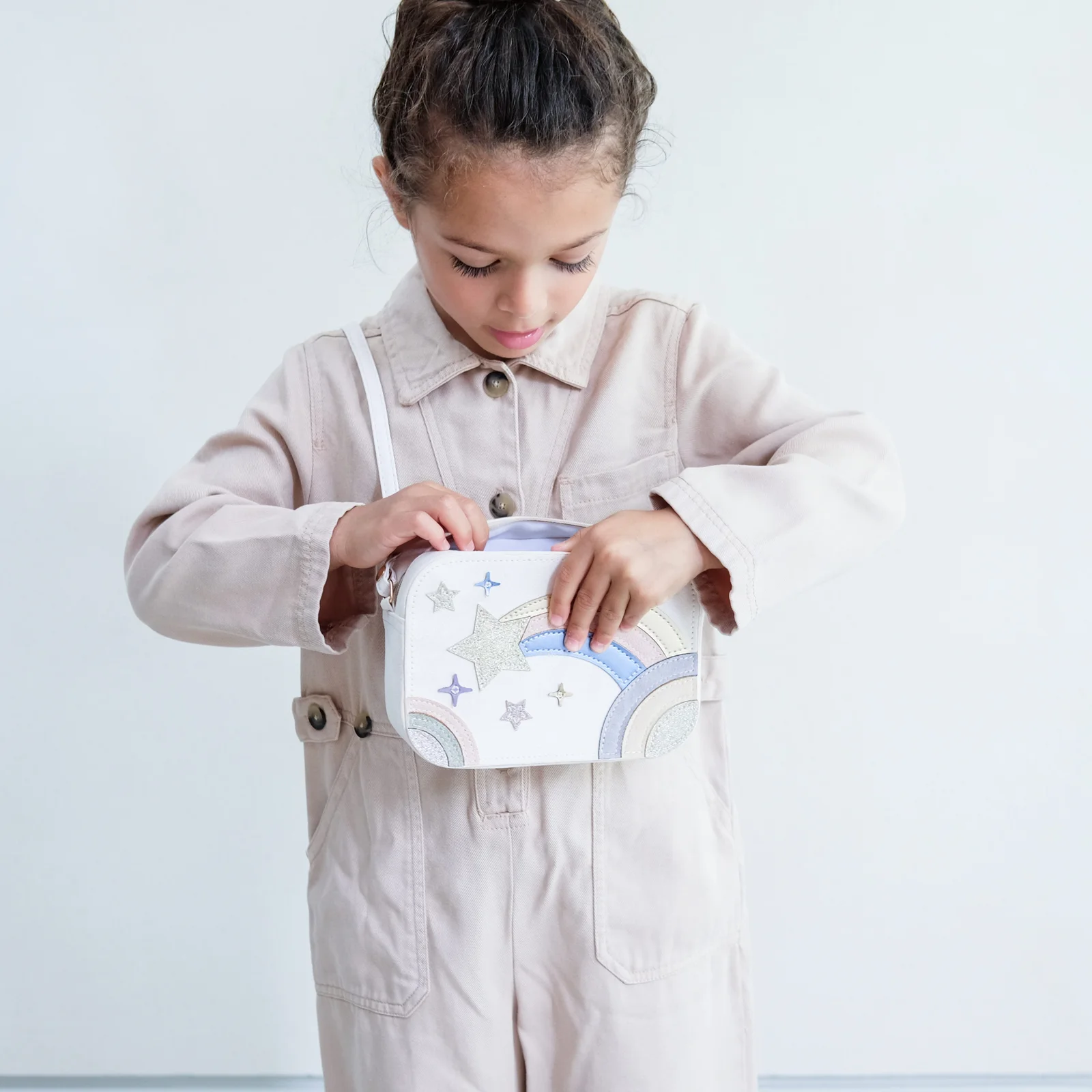 حقيبة جميلة مزينة بزخارف معدنية وبراقة في مجموعة من الألوان الصيفية.