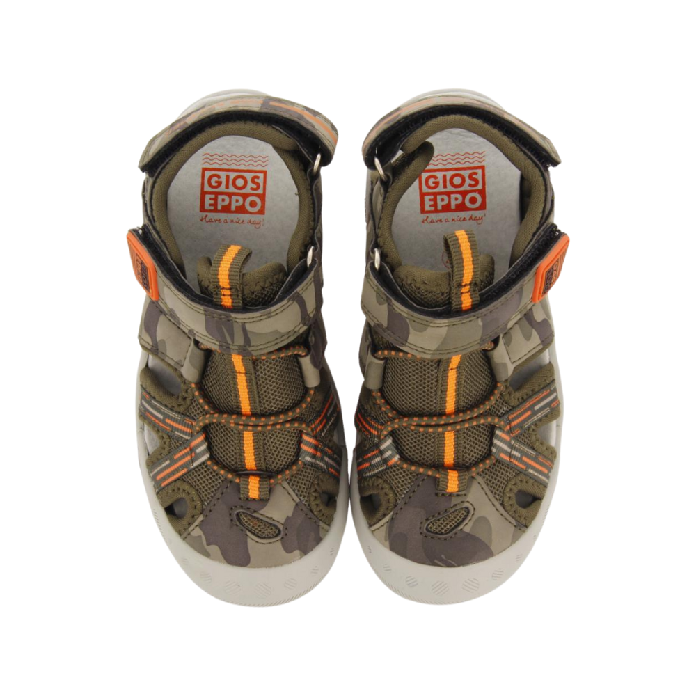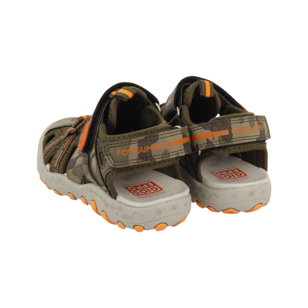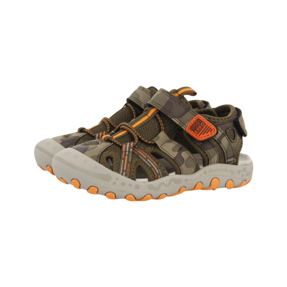 مثالي لطفلك الصغير! صندل رياضي مموه بأربطة قابلة للتعديل عند الكعب. مصنوع من خامات تقنية ويتميز بأربطة من النايلون المموه والنايلون الكاكي مع لمسات برتقالية. نعل داخلي مبطن ناعم للغاية ونعل خفيف الوزن من مادة TPR مع لمسات حمراء. البطانة والنعل الداخلي مصنوعان من البوليستر.
