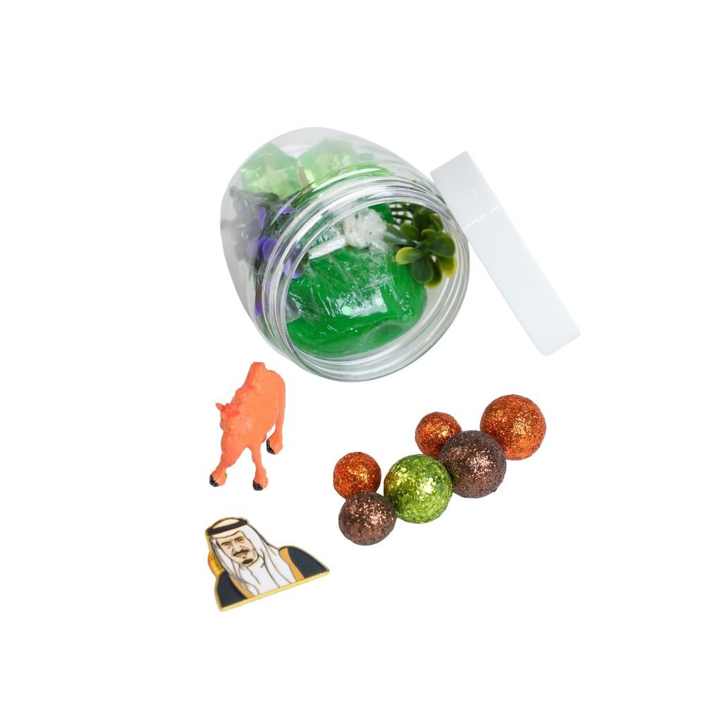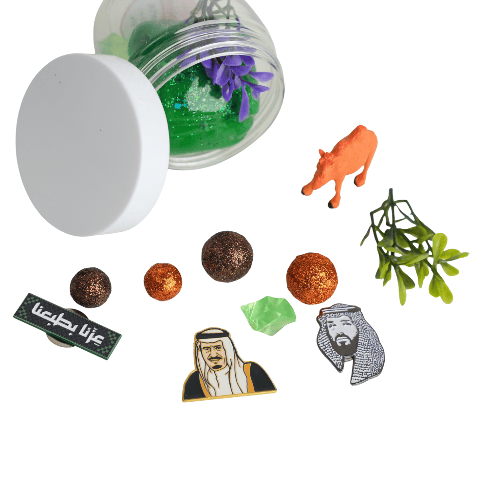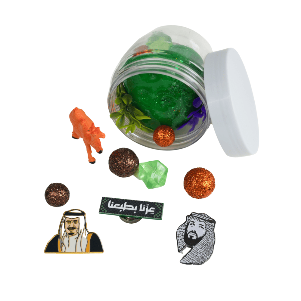 احتفل باليوم الوطني السعودي بطريقة ممتعة وإبداعية! تأتي هذه العلبة الخاصة بعجينة اللعب الناعمة باللون الأخضر مع إكسسوارات مميزة مثل الجِمال الصغيرة، الكرات اللامعة، الأحجار الزخرفية، والرموز الوطنية. يمكن للأطفال تشكيل وصنع مجسماتهم الخاصة مع تعزيز ارتباطهم بالتراث السعودي بشكل تفاعلي ومرح.