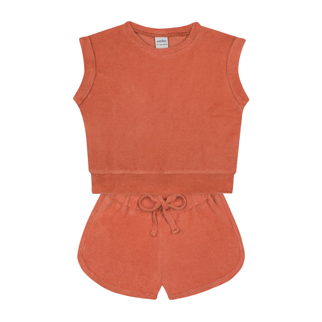 طقم مكون من قطعتين: توب بدون أكمام وشورت رياضي بحافة منحنية. يتميز الشورت بخصر مطاطي ورباط قابل للتعديل من الأمام، مثبت من أجل السلامة.