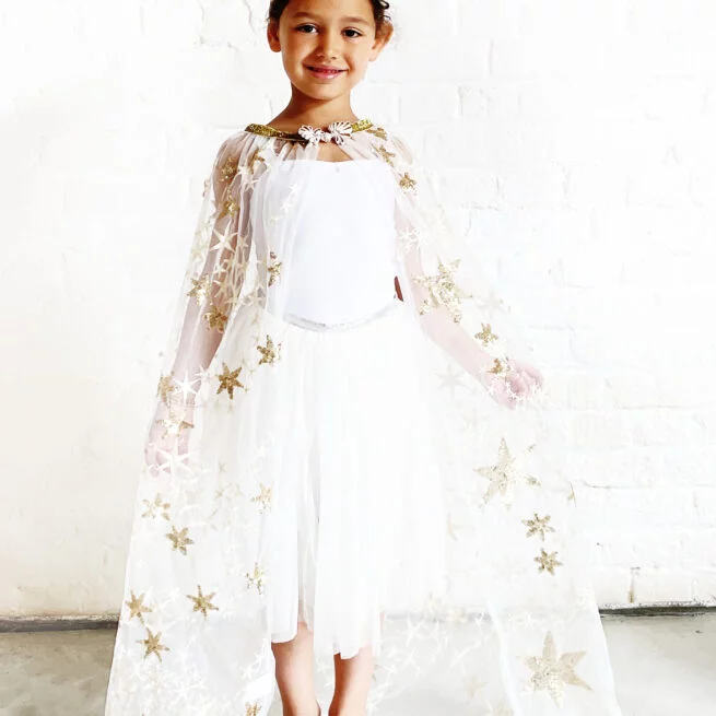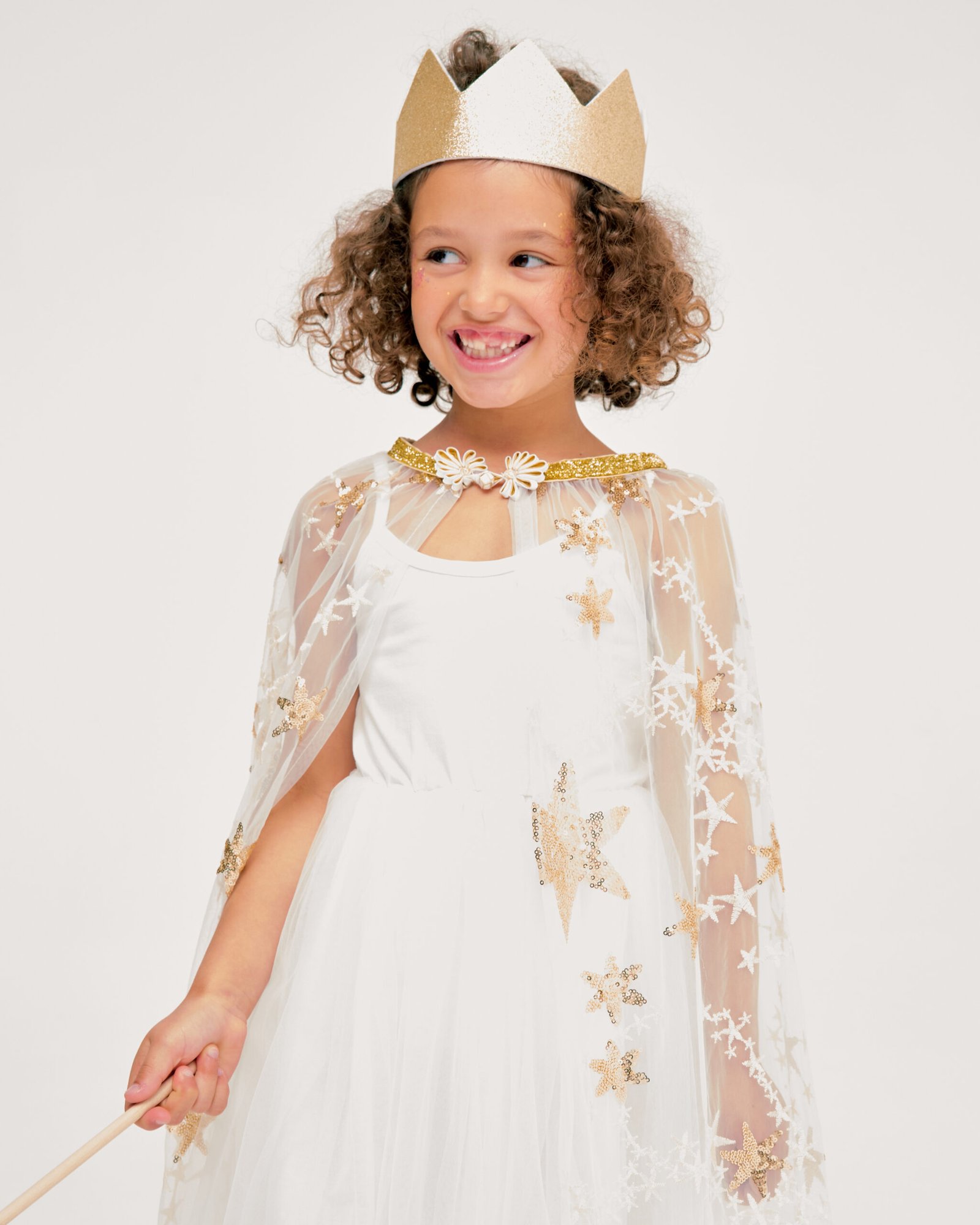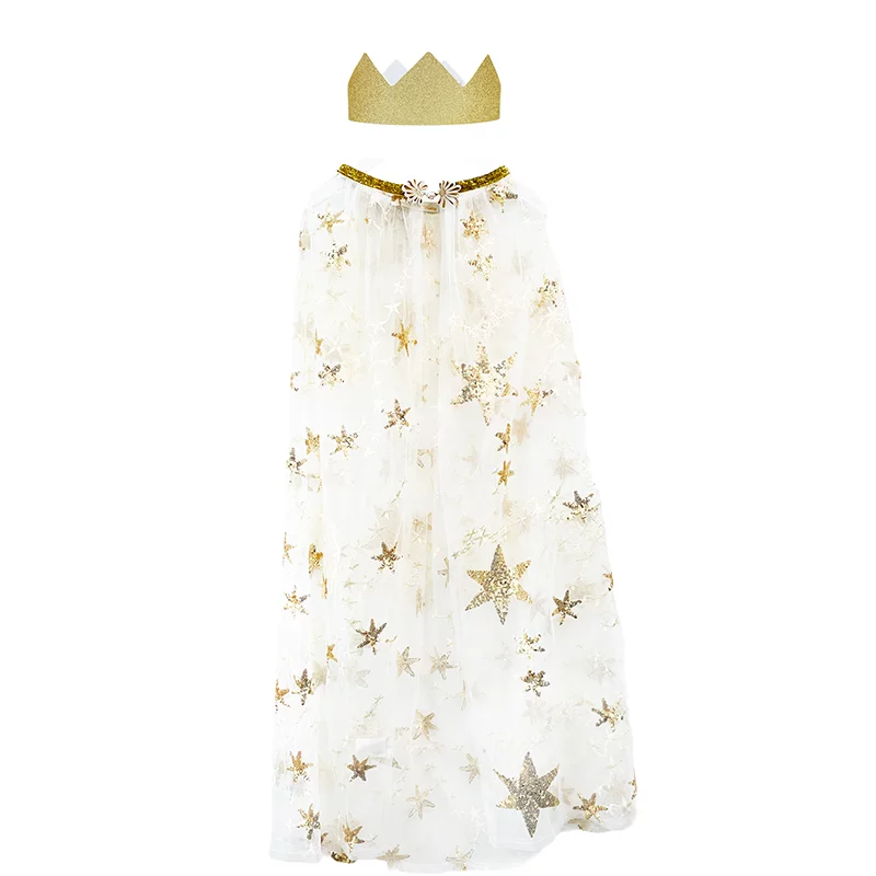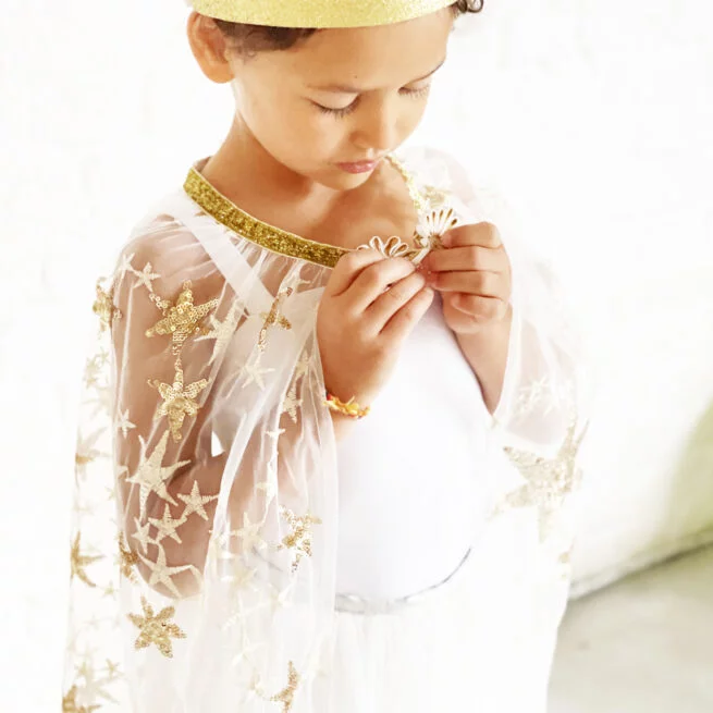 Created by Ratatam, the QUEEN KIT is a complete disguise set including: 1 cape embroidered with gold sequins (which ties at the neck thanks to a system of fasteners at the neckline) + 1 gold sequined crown adjustable to the head size thanks to a velcro patch system.