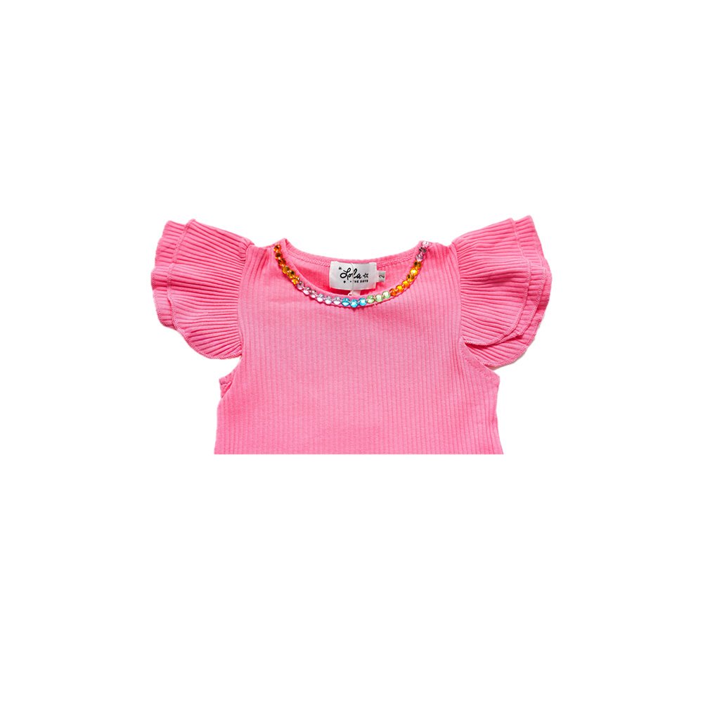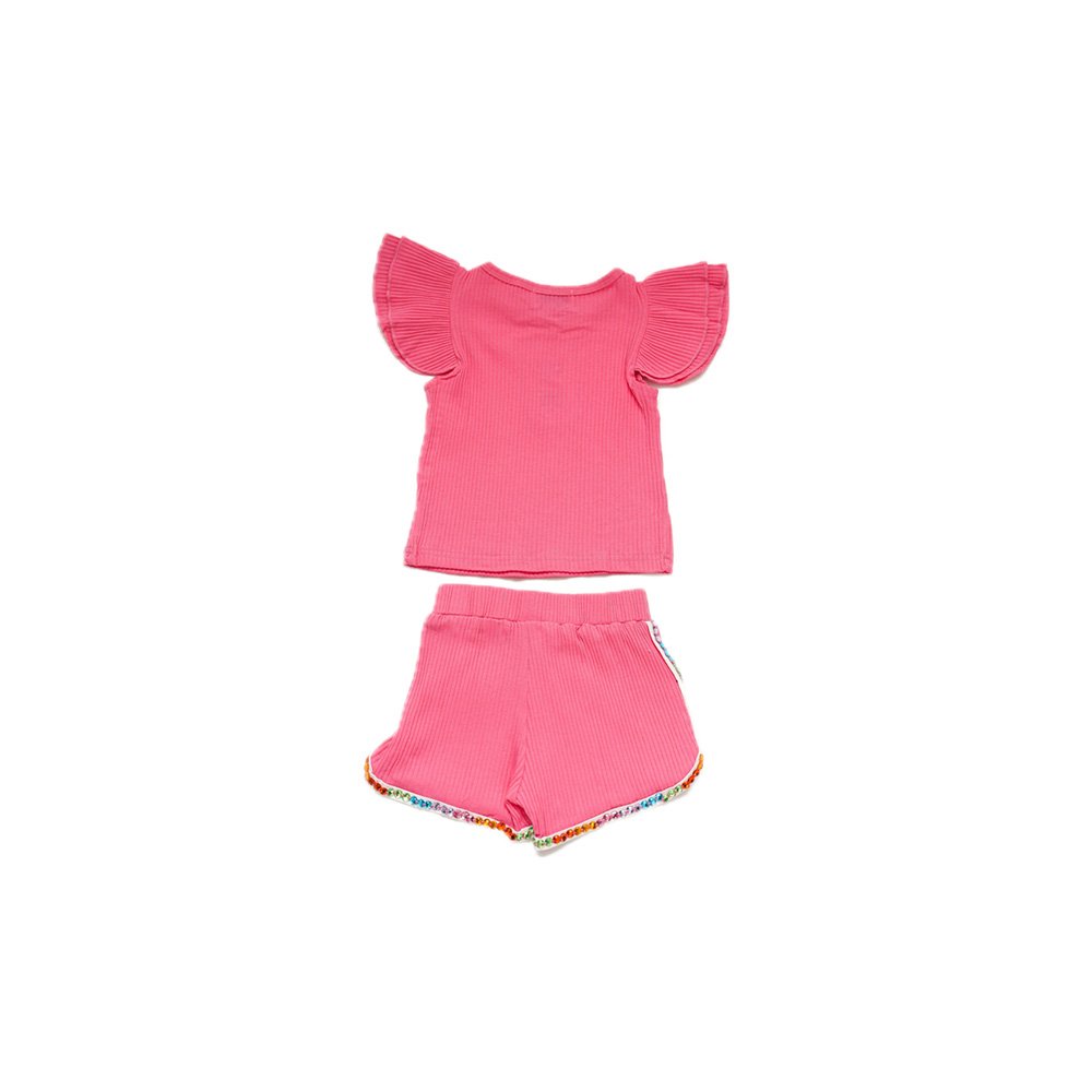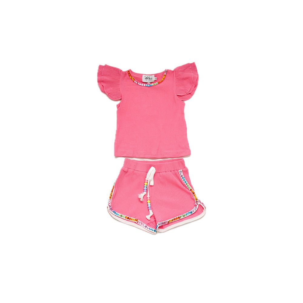 - Includes a ruffled short-sleeve top and coordinating shorts with gem bead accents, ensuring a coordinated and stylish look.