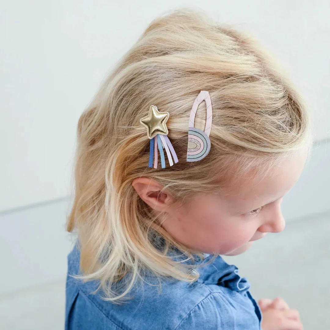 A new pack of dreamy clips in the prettiest pastel shades! Two gorgeous glittering rainbows and two shooting stars superimposed with little ribbon trails! 4 per pack.