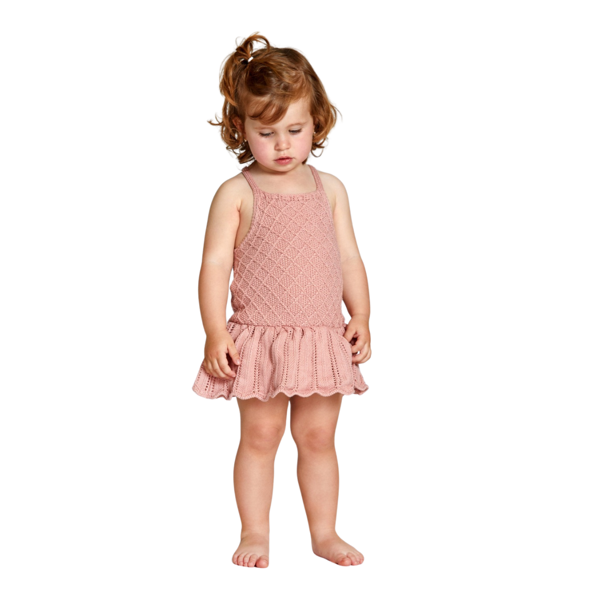 The Nueces Dusty Pink Skirt Romper is a sweet and stylish outfit for little ones. Made from soft knitted fabric, this romper features delicate patterns and a playful skirt detail. Perfect for special occasions or everyday wear, it combines comfort and elegance effortlessly.