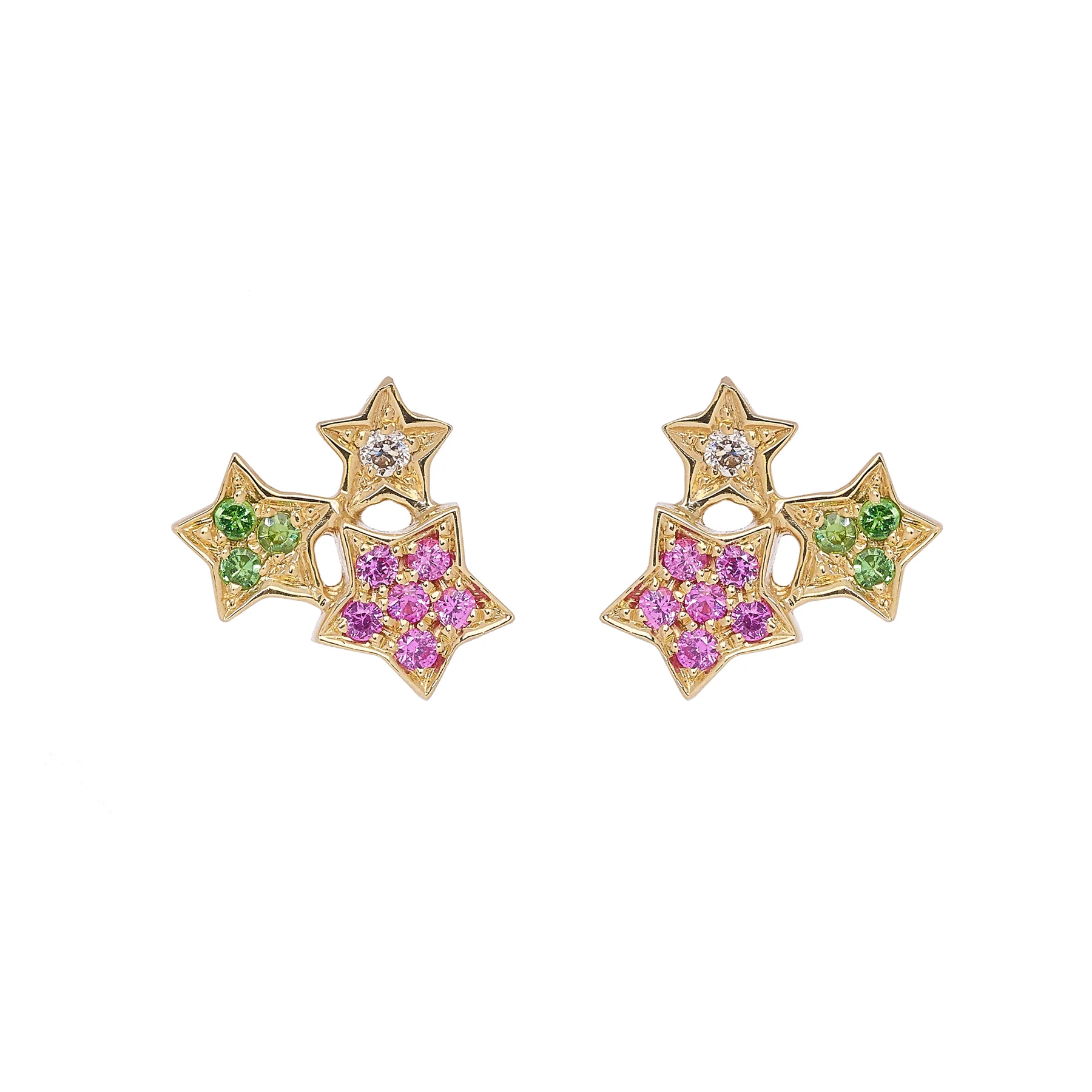 Our signature Midday Star Cluster Earrings evoke the rich and warm colors of our solar system. The tiny constellation of tsavorite, pink sapphire, and white diamonds recall the continuous movement of the planets and emanate an intoxicating reflection of light when caught in the sun.