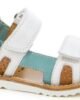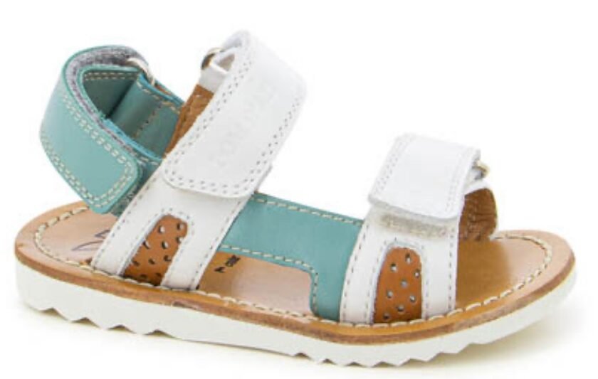 This children’s sandal is presented in a white and light blue leather version. This flexible and light shoe is designed with quality materials for good foot development. Easily adjustable thanks to its scratches, it corresponds to the widest feet.